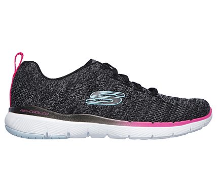 Add a splash of color to your workout look with super flexible comfort in the SKECHERS Flex Appeal 3.0 - Reinfall shoe. Soft flat knit mesh fabric upper in a lace up athletic sporty training sneaker with stitching accents and Air Cooled Memory Foam insole.