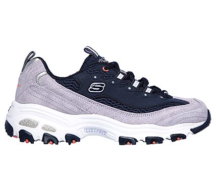 Show off all your colorful contrasts in signature sporty style with the SKECHERS D'Lites - Moon View shoe. Soft suede, smooth leather and eyelet mesh fabric upper in a lace up sporty casual fashion sneaker with stitching and overlay accents. Air Cooled Memory Foam insole.
