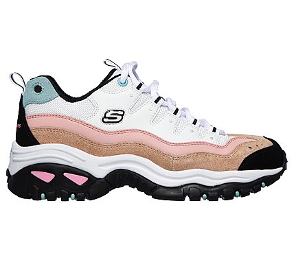 Get that classic colorful style with 'new vintage' feel and comfort in the SKECHERS Energy - Sunny Waves shoe. Smooth leather, synthetic and mesh fabric upper in a lace up sporty walking fashion sneaker with stitching and overlay details.