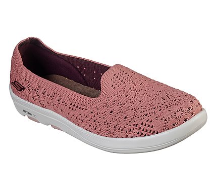 A pretty sleek style combines with lightweight flexible comfort in the Skechers On the GO Bliss - Elation shoe. Soft crochet knit mesh fabric upper in a casual comfort slip on walking skimmer sneaker moc with Air Cooled Goga Mat® insole, ULTRA GO cushioned midsole and Comfort Pillar Technology.