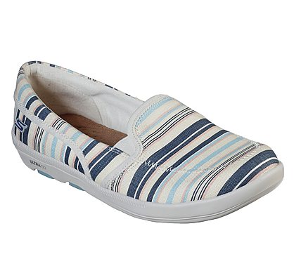 Color and comfort combine to make true casual walking style and enjoyment in the Skechers On the GO Bliss - Resort shoe. Soft woven striped canvas fabric upper in a casual comfort slip on walking sneaker moc with Air Cooled Goga Mat® insole, ULTRA GO cushioned midsole and Comfort Pillar Technology.