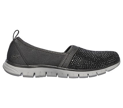 Go for the glittering style in a cushioned flexible design with the SKECHERS Relaxed Fit®: EZ Flex Renew - Shimmer Show shoe. Soft sleek Lycra fabric upper in a slip on sporty casual sneaker with stitching and overlay accents. Rhinestone accented front panel, Air Cooled Memory Foam insole.