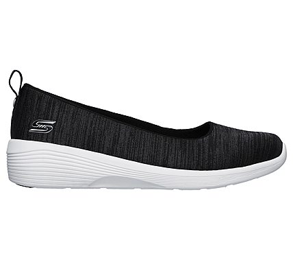 Add some sleek versatile style and easy-wearing comfort to your list with the SKECHERS Arya - Different Edge shoe. Nearly one piece soft woven heathered-finish jersey fabric upper in a slip on sporty casual comfort skimmer sneaker with stitching and overlay accents. Air Cooled Memory Foam insole, medium wedge lightweight heel.