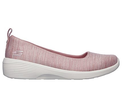 Add some sleek versatile style and easy-wearing comfort to your list with the SKECHERS Arya - Different Edge shoe. Nearly one piece soft woven heathered-finish jersey fabric upper in a slip on sporty casual comfort skimmer sneaker with stitching and overlay accents. Air Cooled Memory Foam insole, medium wedge lightweight heel.