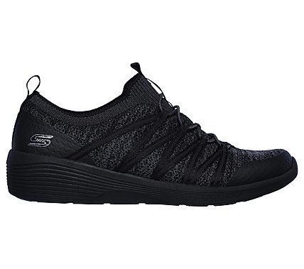 Climb to new heights of sleek sporty style and comfort wearing the SKECHERS Arya shoe. Nearly one piece soft smooth flat knit mesh fabric upper in a bungee laced slip on sporty casual comfort sneaker with stitching and overlay accents. Air Cooled Memory Foam insole, medium wedge lightweight heel.