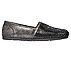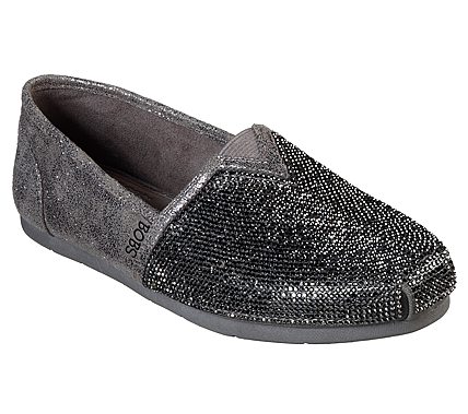 Put some fun sparkle into your style with the SKECHERS Luxe BOBS - Tea Rose shoe. Smooth metallic faux leather and rhinestone accented fabric upper in slip on casual alpargata flat with stitching and overlay accents. Memory Foam insole.